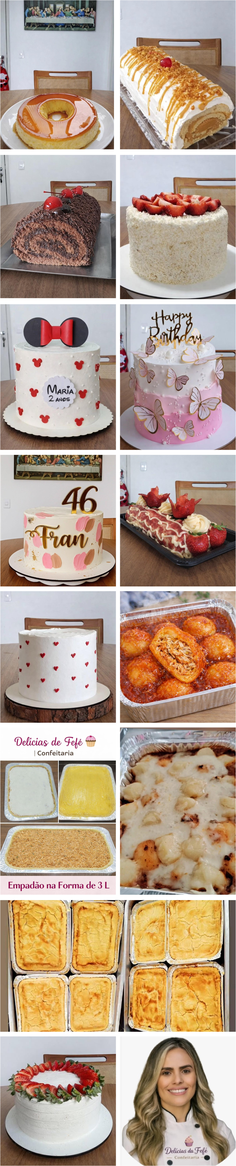 Também fazem parte das criações os inhoques, rocamboles, pudins e bolos decorados, preparados com massas amanteigadas, de baunilha ou chocolate, sempre com atenção minuciosa aos detalhes.