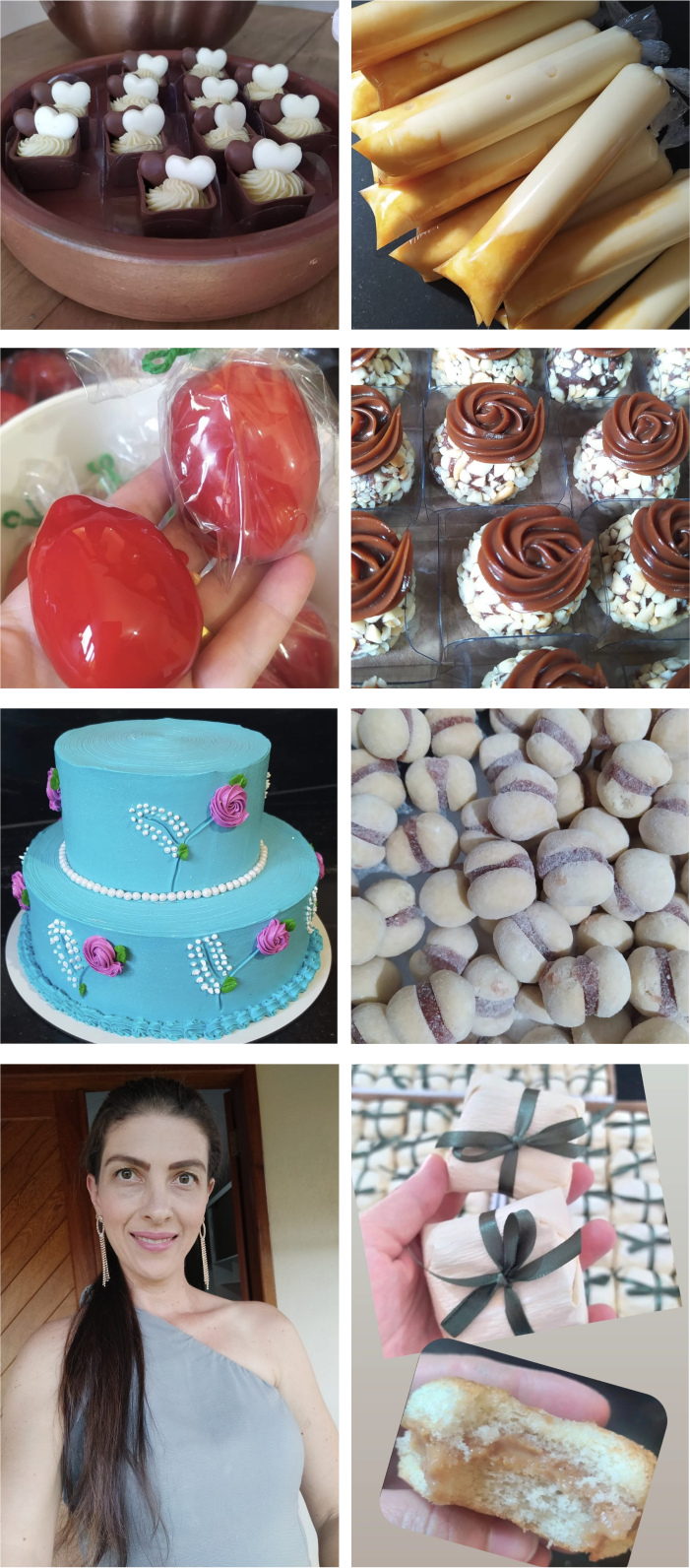 De 2 kg de bolo por semana, passou a entregar 24 kg só para um evento. Já produziu mais de 1.500 docinhos para um único casamento, além de 200 bem-casados; e não costuma parar em uma festa só por final de semana, são duas, às vezes mais, além dos bolos para cafés da manhã de dois comércios que atende.