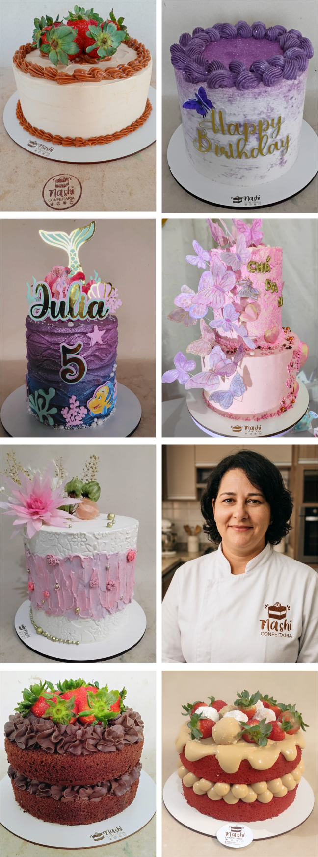 Nashi Confeitaria mantém um estilo artesanal e familiar. A produção acontece na sua própria casa, com apoio do marido e do filho, enquanto ela mesma é responsável pela confeitaria. Seu foco está nos: bolos de festa, tortas e doces preparados com atenção aos detalhes.