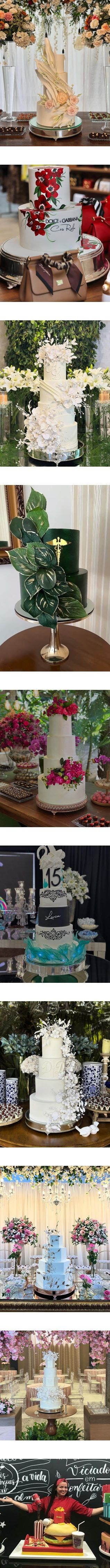 Em cada ocasião, seus bolos ocupam lugar de destaque, compondo a decoração como verdadeiras peças autorais.